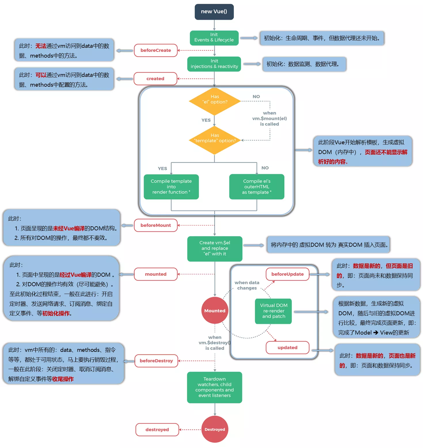 beforeDestroy()=> 此时vm上所有东西都是可用的,但不再解析模板更新页面destroyed()=> vm彻底被销毁