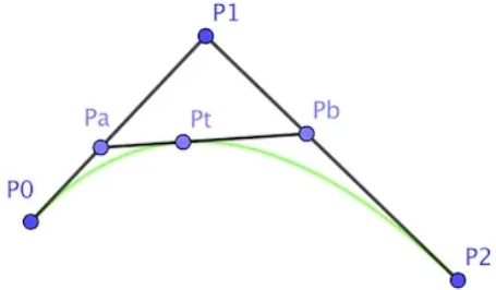 每个运动点在各自线段上都可视为一阶贝塞尔曲线:Pa = (1 - t)P0 + tP1Pb = (1 - t)P1 + tP2Pt = (1 - t)Pa + tPb