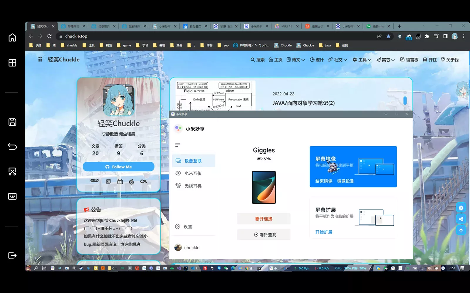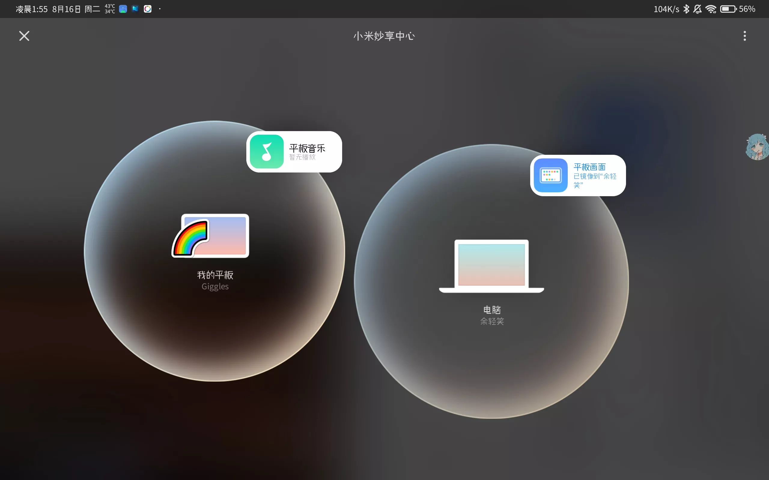 应用流转仅限于小米的设备,自然投屏也需要小米笔记本才行,不过酷友@迷璐的模块可以让其它品牌的电脑也出现在妙享界面,只需要将平板画面拖到电脑的气泡上,1-2秒后,电脑上就有平板的投屏窗口了,投屏后平板可关闭屏幕。
