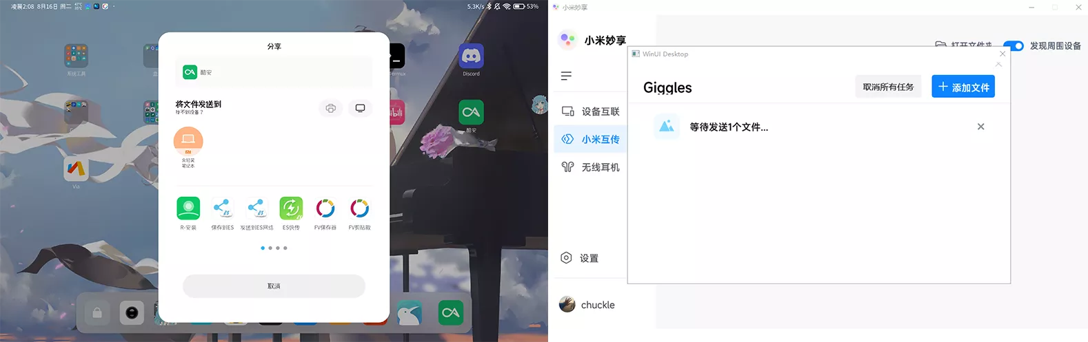 平板长按文件点分享,选择电脑即可;电脑端使用用小米互传向平板传文件,两种操作都非常方便且快速。