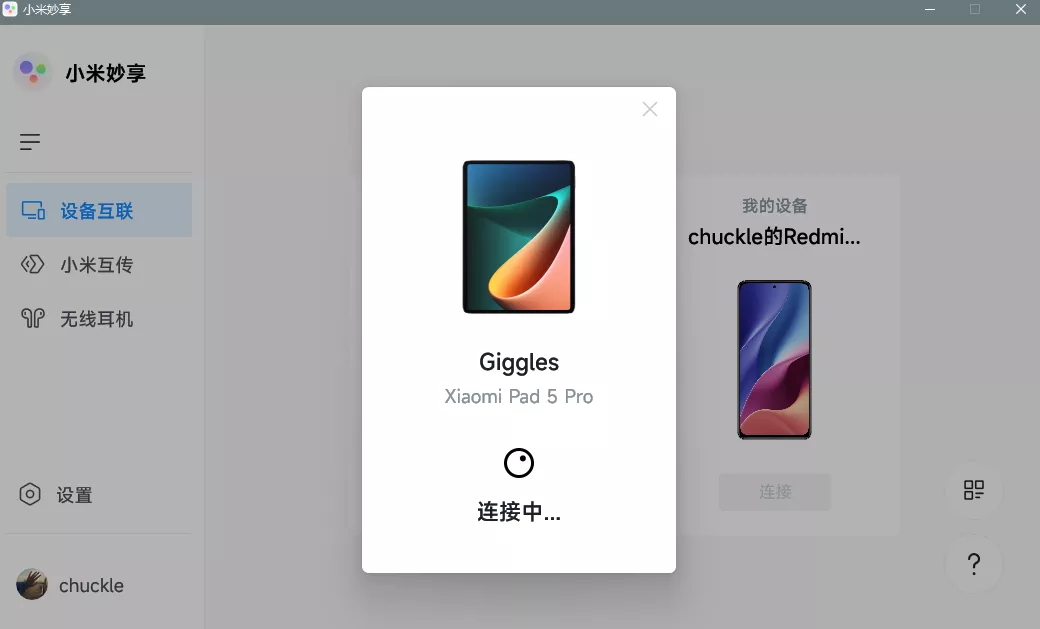 电脑打开蓝牙,平板打开蓝牙、wifi、小米互传,让设备处于同一网络下,电脑端点击连接,等待1-2秒,很快即可连接上。且蓝牙wifi我一般保持常开,平板使用时也是手机或电脑给平板开热点,基本能做到需要就点击连接。