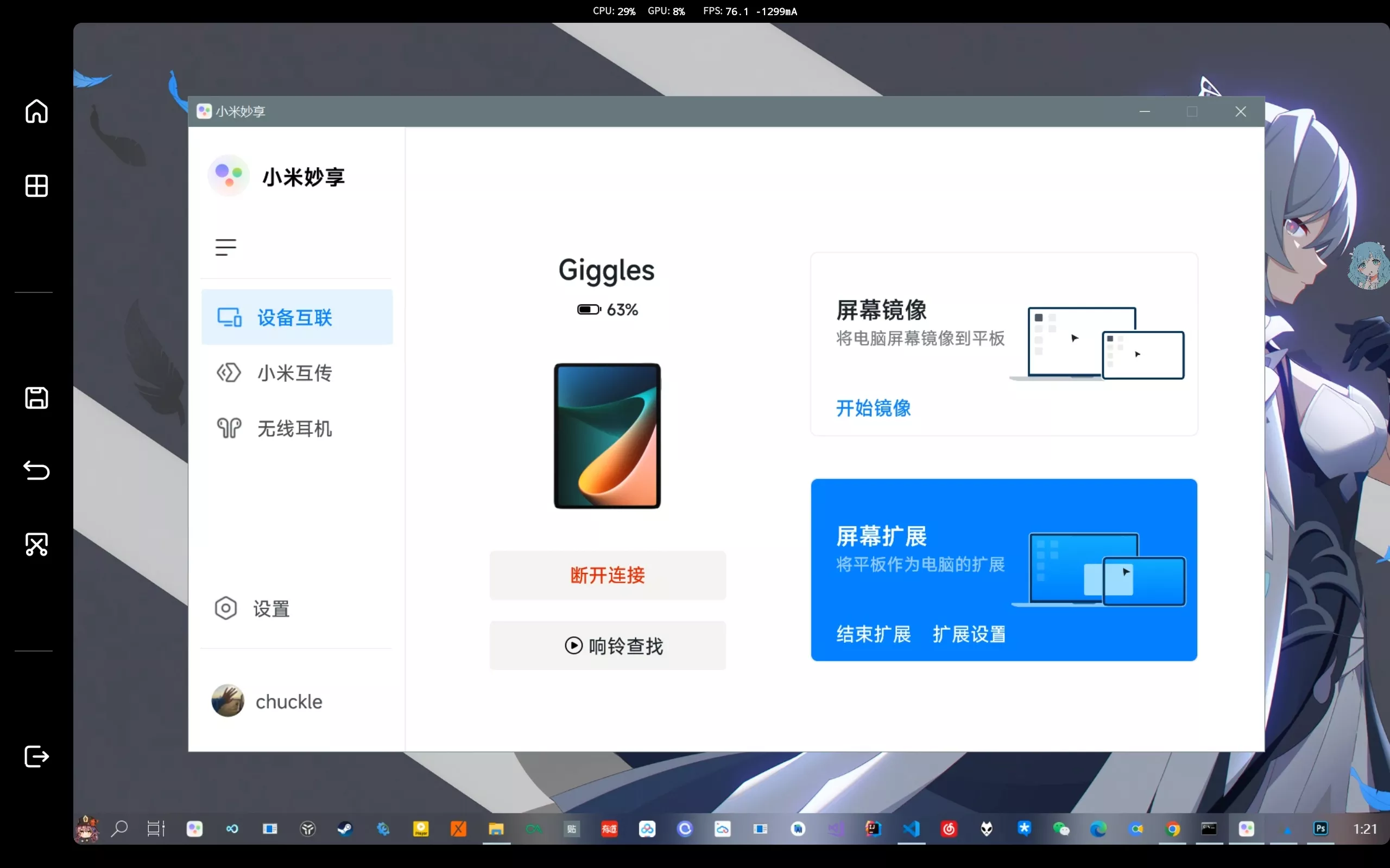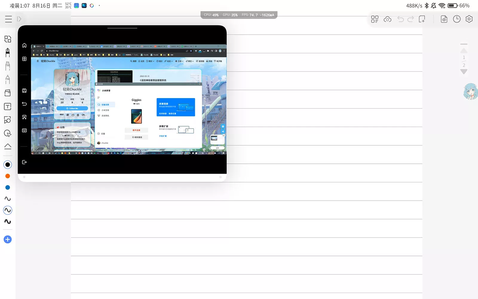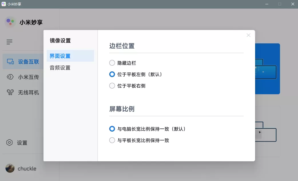 作为扩展屏时与镜像屏时差不多,同样有低延迟、高分辨率(作为扩展屏时分辨率1920*1200),同样可以挂后台挂小窗,设置侧边栏的位置、使用米板作为电脑的音频输出等。