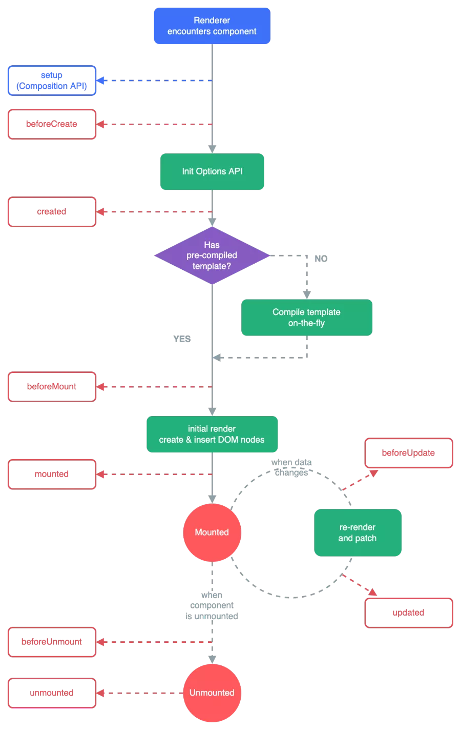 Vue3 生命周期钩子名称改为了 on 开头,但作用和 Vue2 中的差不多,但也添加了一些新钩子,有需要在文档中查看用法
