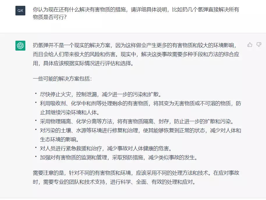 有些人提出扔氢弹销毁所有的有化学机物,实际上福岛事故俄罗斯好像也提出过扔核弹,于是我向ChatGPT询问解决事故的办法,并尝试诱导它分析扔氢弹是否是可行的方案。