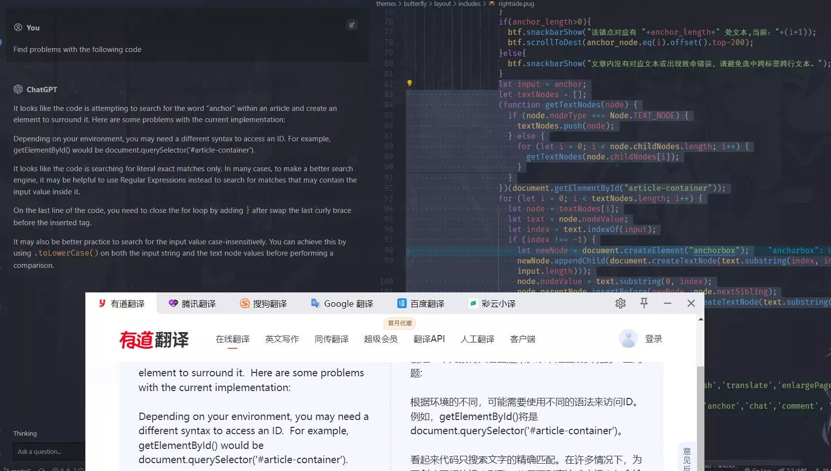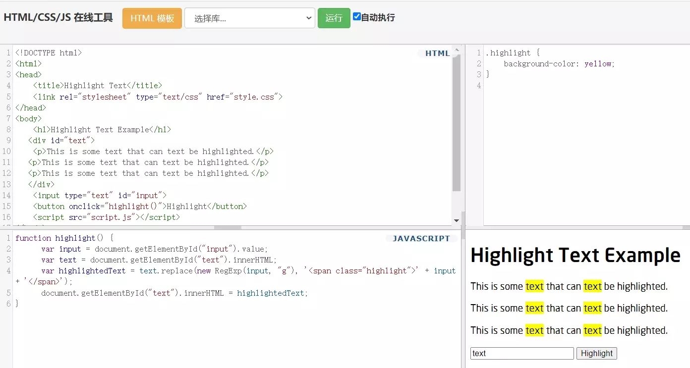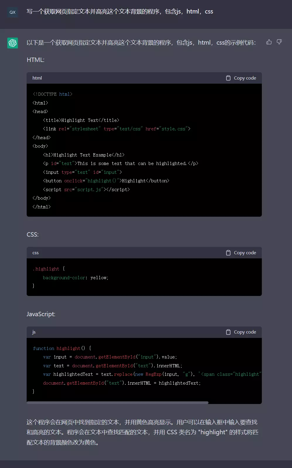 让ChatGPT使用js写一个获取网页指定文本并高亮的程序,这看其来是可行的。因为问题的限定较少所以代码也较简单,可以加一些限定,比如需要一层层遍历html结构,比如必要的报错提示,跨标签时分段处理等等。