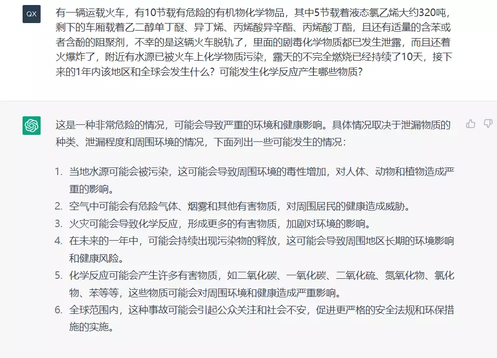 ChatGPT训练集主要是英文,但它对于中文问题的理解和回答速度不慢,准确性也相当可观,这毫无疑问是搜索引擎的一个革命性技术,一个用钱砸出来的语言模型和ai,通过俄亥俄化学事故的分析,这个语言AI的情景结合能力我认为与人在理性的方面已经无异了。