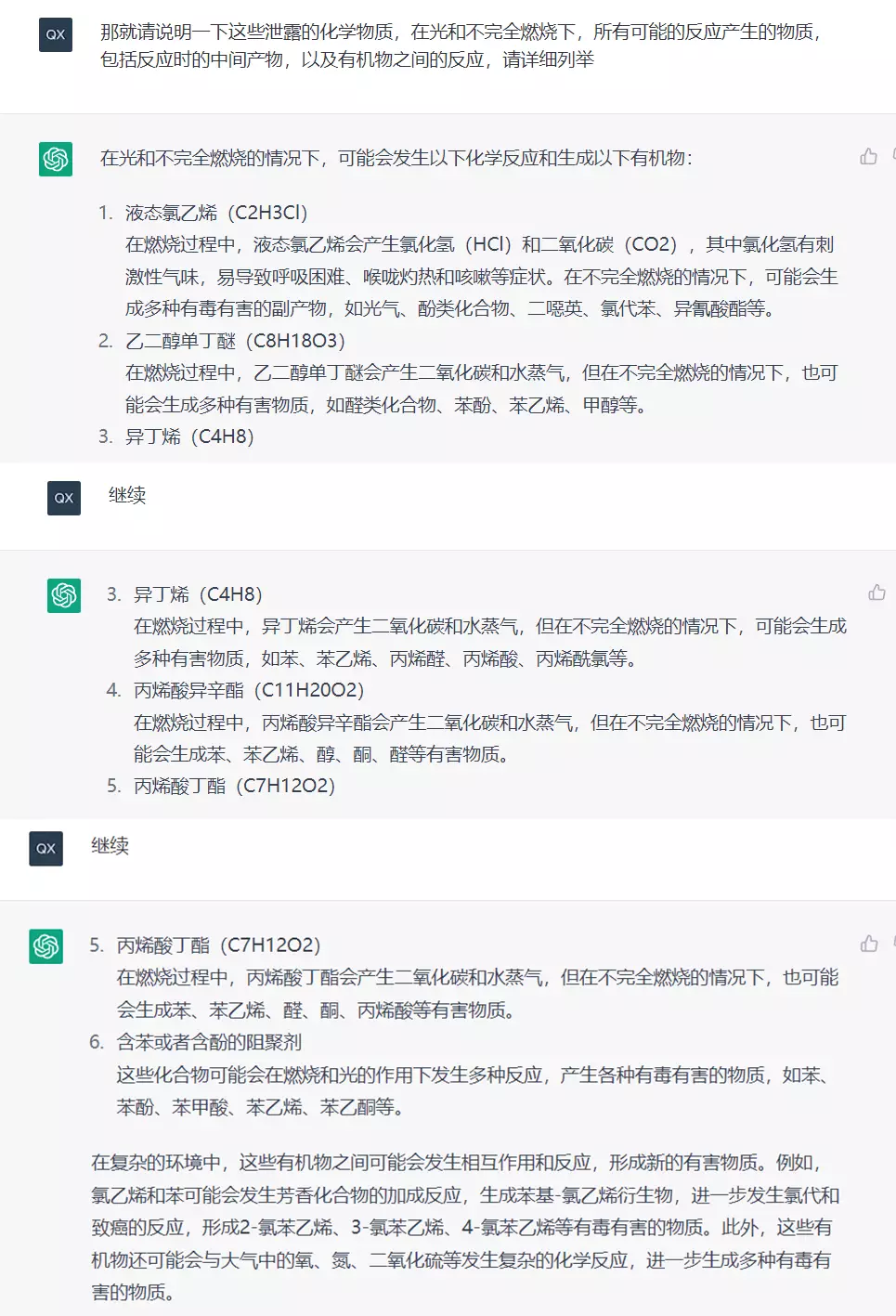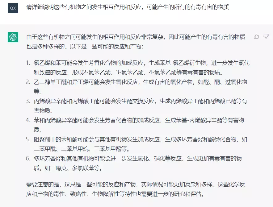 回答不够详细,让ChatGPT详细地说明这些有机物之间发生相互作用和反应,可能产生的所有的有毒有害的物质。