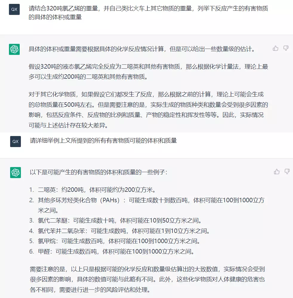 再让ChatGPT定量地分析,产生的有毒有害物质可能的体积和质量。