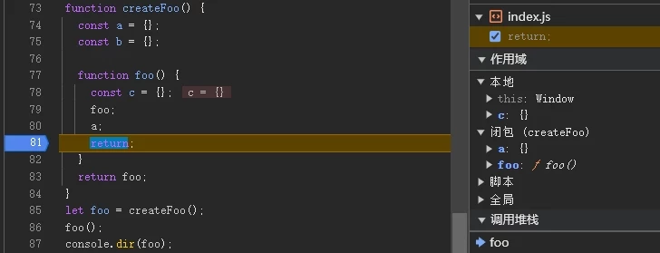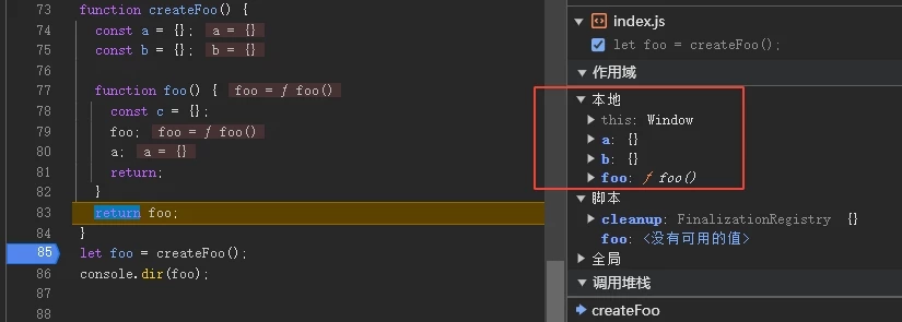 foo 函数没有被执行,而在执行 createFoo 函数时,foo 函数已经被预解析成函数对象,并且可以看到其 createFoo 函数闭包,包含了 a、b 两个变量的引用。