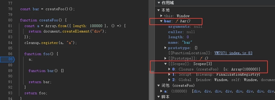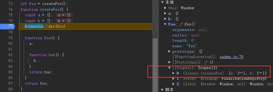 即使 bar 函数没有引用 createFoo 函数作用域的 a、b 变量,但其父函数 foo 引用了,所以 bar 函数对象的 [[Scopes]] 属性中也包含了 createFoo 函数的闭包对象。